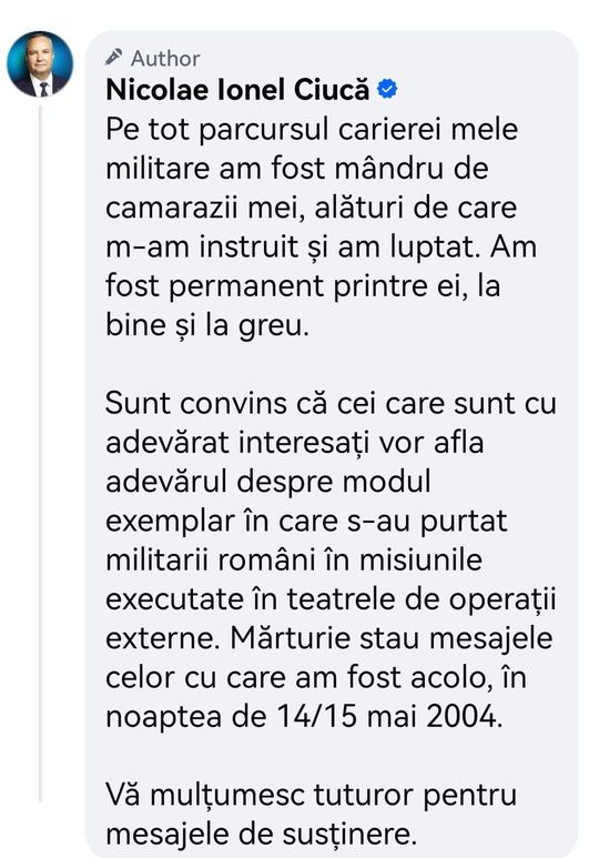 ”Pe tot parcursul carierei mele militare am fost mândru de camarazii mei, alături de care m-am instruit şi am luptat. Am fost permanent printre ei, la bine şi la greu. Sunt convins că cei care sunt cu adevărat interesaţi vor afla adevărul despre modul exemplar în care s-au purtat militarii români în misiunile executate în teatrele de operaţii externe. Mărturie stau mesajele celor cu care am fost acolo, în noaptea de 14/15 mai 2004. Vă mulţumesc tuturor pentru mesajele de susţinere”, a scris Ciucă.