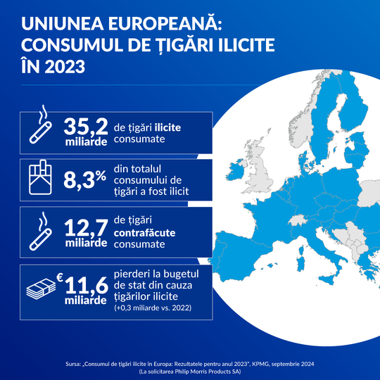 Rezultatele studiului anual KPMG din 2023 privind consumul ilicit de ţigări, realizat la cererea Philip Morris International, relevă faptul că piaţa ilicită din UE continuă să fie o ameninţare majoră pentru sănătatea şi securitatea publică, precum şi pentru economiile statelor. Ţigările contrafăcute rămân una dintre principalele surse de consum ilicit din regiune, cu 12,7 miliarde (36%) de ţigări consumate – pe măsură ce reţelele infracţionale vizează din ce în ce mai mult pieţele cu taxe mai mari şi cu preţuri mai mari. În ansamblu, guvernele din UE au pierdut venituri fiscale estimate la 11,6 miliarde EUR, în creştere faţă de 11,3 miliarde EUR în 2022. Franţa conduce, în continuare, în clasamentul ţărilor cu cel mai mare consum ilicit din Europa, cu 16,8 miliarde de ţigări ilicite şi 7,3 miliarde EUR venituri fiscale pierdute.