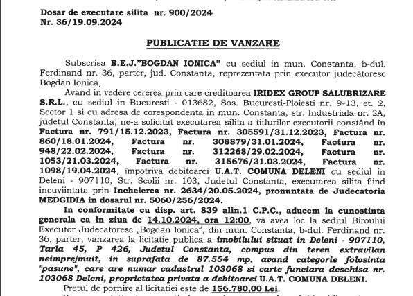 Nu mai târziu de anul trecut, Primăria Deleni a fost la un pas să ajungă în pragul falimentului din cauza datoriilor acumulate de-a lungul timpului. Cu toate că primarul Dan Marian a declarat că situația este sub control, executorii judecătorești scot un teren la licitație. Este vorba despre un teren extravilan cu o suprafață de aproape 9 hectare, localizat în comuna Deleni, proprietatea UAT Deleni, care a fost scos la licitație, la cererea creditorului Iridex Group Salubrizare SRL. Prețul de pornire este de 156.780 de lei.