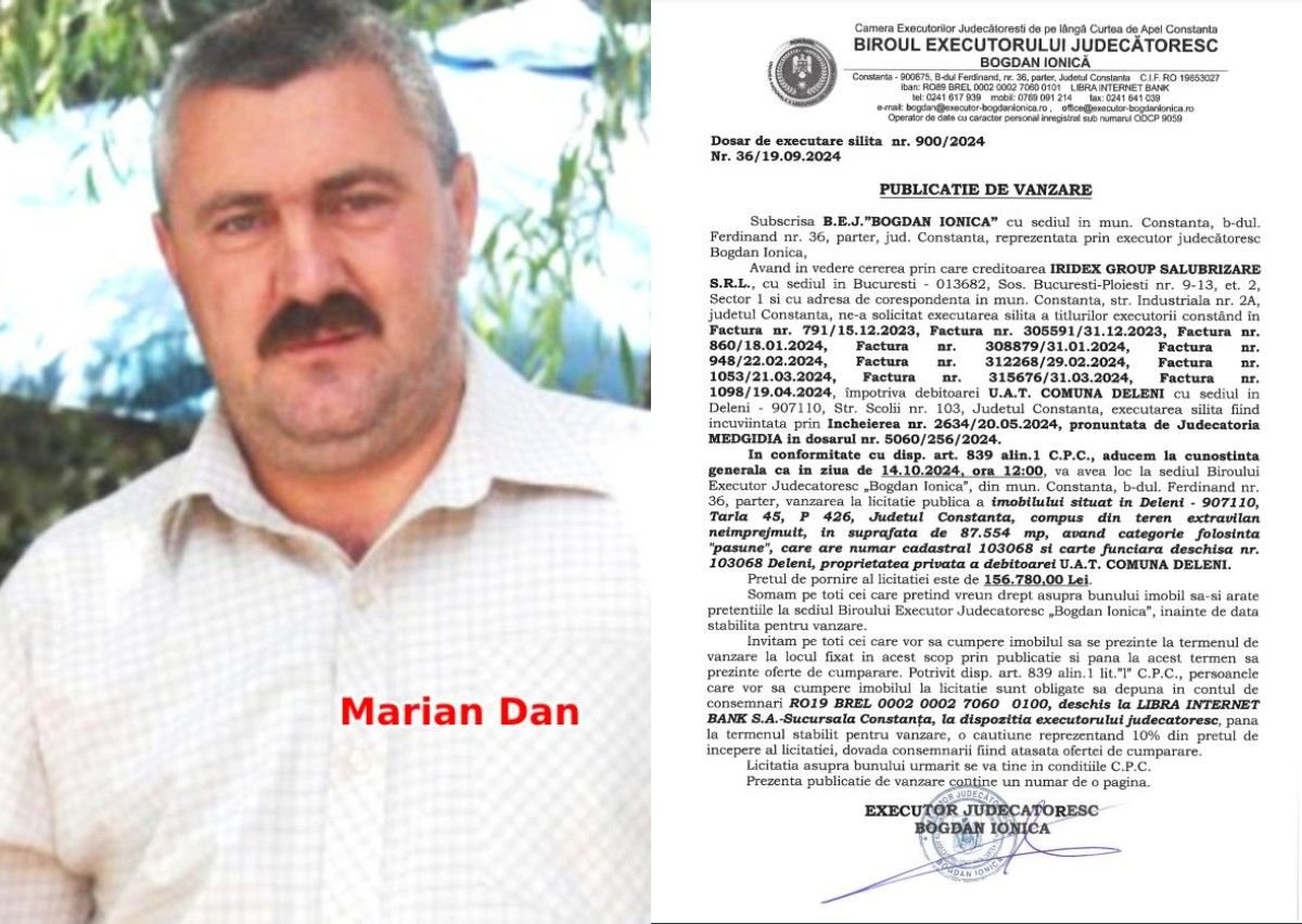 Primarul Dan Marian pierde un teren al comunei pe care o conduce. Astfel, un executor judecătoresc din Constanța anunță organizarea unei proceduri de licitație publică în vederea vânzării unui teren extravilan, în suprafață de 87.554 de mp, aproape 9 hectare, având categoria de folosință „pășune”. Imobilul este situat în comuna Deleni, proprietatea UAT Deleni. Terenul este scos la vânzare la cerere creditorului Iridex Group Salubrizare, din București, în temeiul mai multor titluri executorii.
