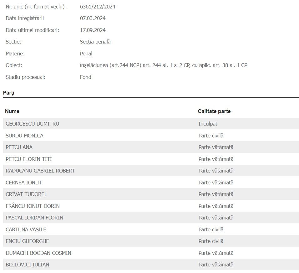 Când l-am contactat pentru un punct de vedere, domnul Georgescu a devenit defensiv și acid, spunând că a „făcut tot posibilul” să îndrepte situația. „Ce voiați să fac, să mă sinucid?”, a întrebat el retoric, sugerând că a rămas în țară ca un fel de erou tragic, luptând pentru a plăti datoriile. „Eu n-am țepuit pe nimeni! Nu sunt 24 de persoane, informați-vă! Eu am încercat să mă împac cu toată lumea”. Totuși, realitatea din dosarele de pe Portalul Instanțelor de Judecată arată altfel, cu două dosare separate, fiecare cu câte 12 victime părți civile, în total 24 de victime.