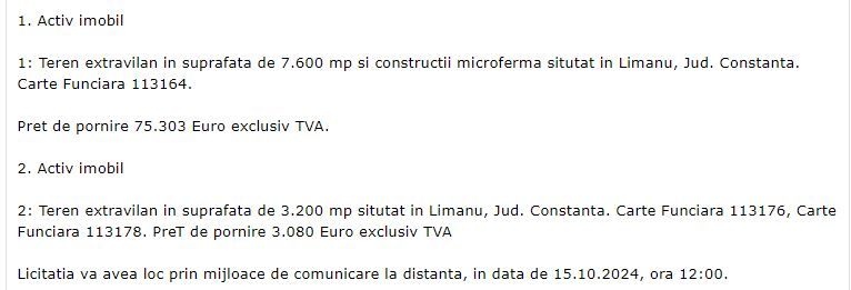 Două terenuri extravilane ale firmei Orion Metropolitan, deținută de Nicolae Daniel Cercel și Gabriel Cercel, pe care au închis-o încă din anul 2008, sunt în atenția lichidatorilor. Au scos la vânzare un teren în suprafață de 7.600 de mp și o microfermă, la prețul de 75.303 de lei. De asemenea, mai vând un teren extravilan de 3.200 de mp, cu prețul de 3.080 de euro, toate sunt situate în Limanu. Licitația este programată pentru data de 15 octombrie a.c.